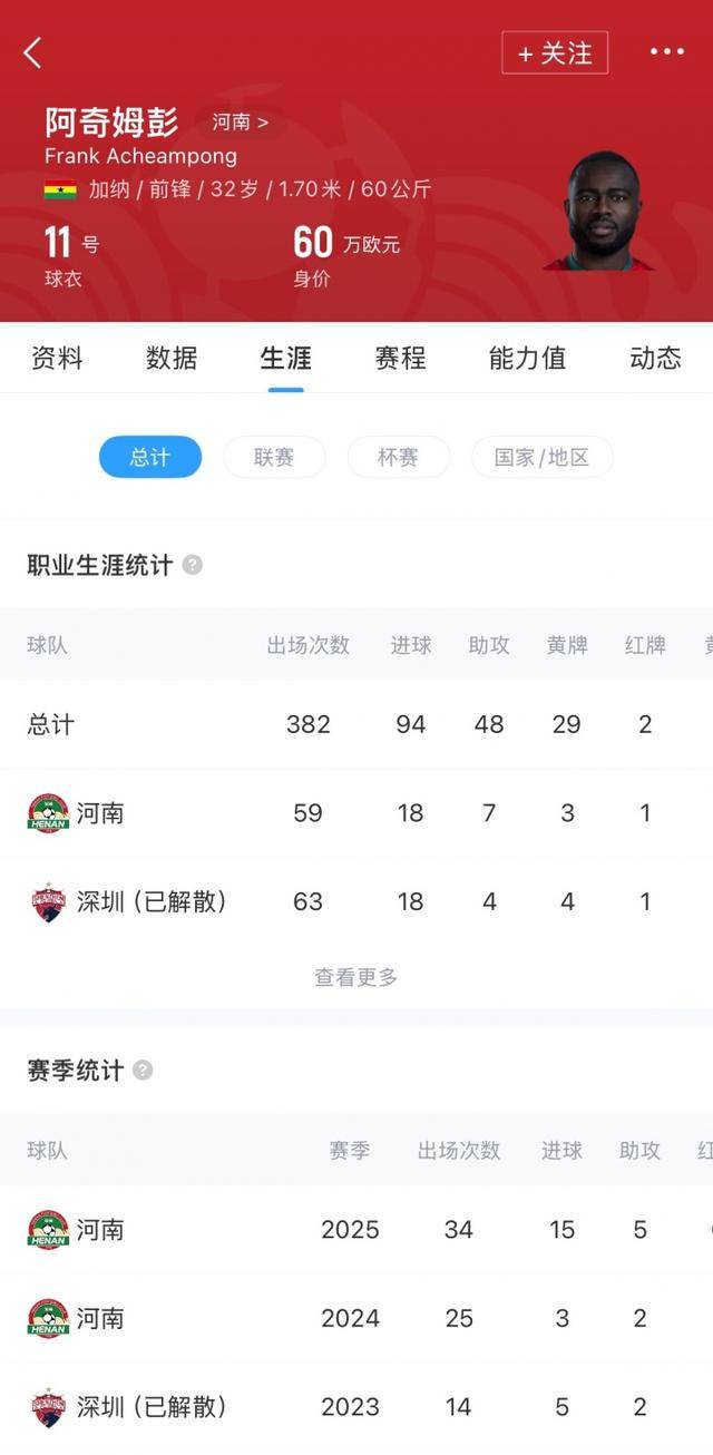 2021年,阿奇姆彭加盟深圳队,在三个赛季里,他依旧保持着高效的进球效率,为球队贡献了18粒进球。2024年,他转战河南队,并在2025赛季迎来了全面爆发。单赛季他攻入15球,还送出3次精彩助攻,凭借出色的表现帮助球队闯入足协杯决赛。同时,他还达成了个人在中国赛场的200场里程碑,这一成就无疑是对他多年努力的最好见证。截至在中国赛场出战211次,累计攻入71球,还贡献了21次助攻,数据之华丽令人赞叹。