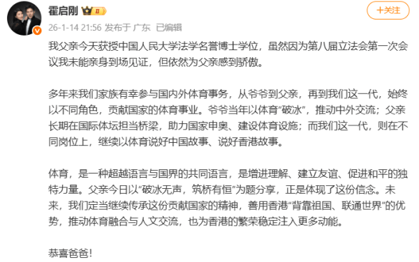 1月14日晚,霍启刚发文祝贺霍震霆:“我父亲今天获授中国人民大学法学名誉博士学位,虽然因为第八届立法会第一次会议我未能亲身到场见证,但依然为父亲感到骄傲。”