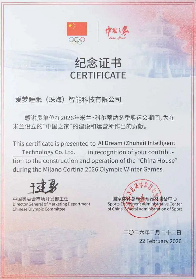 近日,国家体育总局体育器材装备中心正式发来感谢信,对爱梦集团舒达品牌在2026年米兰冬奥会期间,为中国体育代表团保障营以及“中国之家”的建设运营所作出的贡献,表达了高度肯定与深厚感谢。