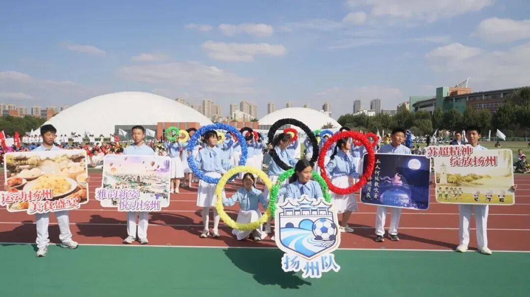 扬州方阵从千里运河碧波中走来,配合如五亭桥般和谐、创意似 “扬州八怪” 般灵动,立志将运动场变为力与美交织的艺术画卷。