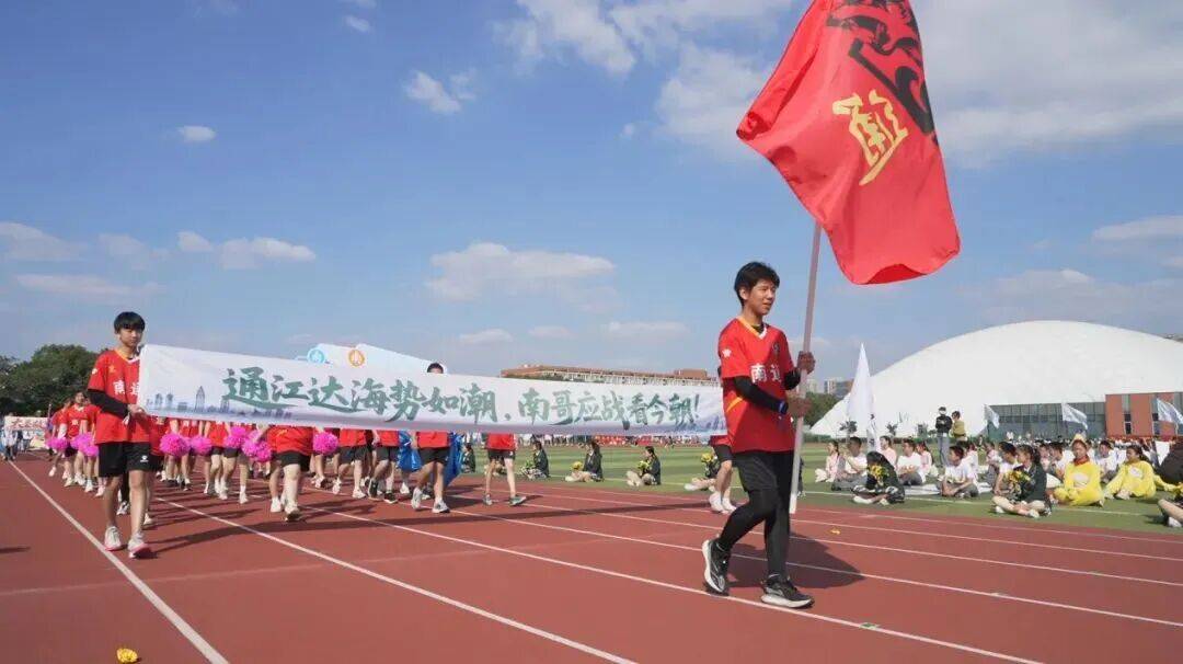 南通方阵脚踏江风海韵而来,千年濠河文脉与体育活力交融,狼山雄浑与蓝印花布雅致相得益彰,同学们将以团结协作姿态助力运动会。